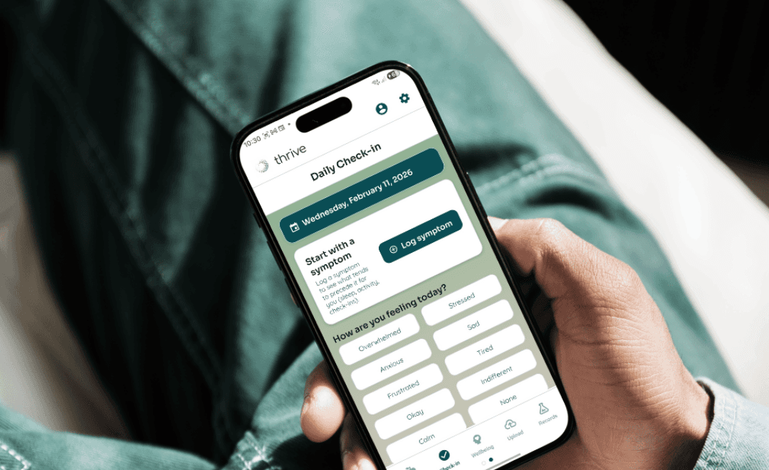 Thrive connects your Thrive wearable, your daily check-ins, your records, and the people who support you, so you see patterns, not just numbers.